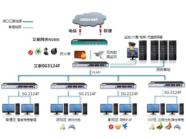 網(wǎng)吧是基于網(wǎng)游、瀏覽網(wǎng)頁、語音、視頻、在線影視等大流量數(shù)據(jù)流的應用復合網(wǎng)絡,將極大的考驗網(wǎng)絡設備的穩(wěn)定性和處理能力,穩(wěn)定性和高速也將直接決定顧客的滿意度,頻繁的游戲掉線,上網(wǎng)卡等問題將極大的影響用戶的上網(wǎng)體驗。