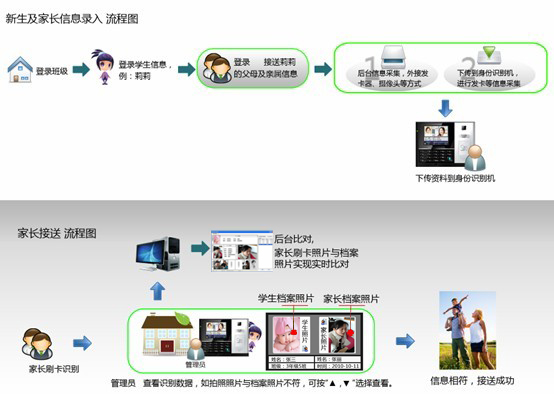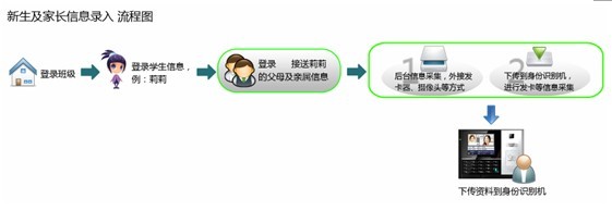 校園新生及家長信息錄入: 新生入學(xué),學(xué)生與家長到校務(wù)辦進(jìn)行信息采集。以本機(jī)采集為例,家長信息錄入以后傳輸?shù)阶R(shí)別機(jī),然后在識(shí)別機(jī)上進(jìn)行發(fā)卡及照片采集,采集完成后,軟件進(jìn)行信息匯總,卡號(hào)及照片存入數(shù)據(jù)庫。后期可增加家長信息數(shù)量,大數(shù)量為10個(gè)。