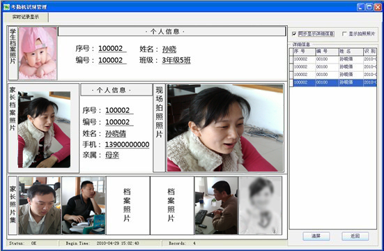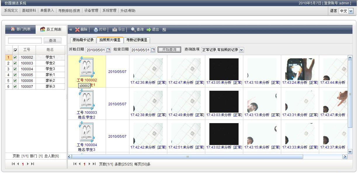 家長接送: 設(shè)備安裝于門衛(wèi)室旁,家長進(jìn)門時(shí),首先進(jìn)行刷卡,家長刷卡以后,管理員現(xiàn)場(chǎng)查看刷卡信息,比對(duì)照片,如與檔案照片不符(因小孩可能對(duì)應(yīng)多位家長接送),則按“↑”與“↓”鍵,查看所屬其他家長照片,查到該家長照片則完成接送。 后臺(tái)管理員可實(shí)時(shí)查看刷卡數(shù)據(jù),實(shí)現(xiàn)實(shí)時(shí)查看。