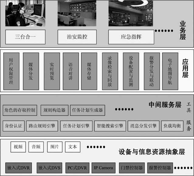 第四層為設(shè)備與信息資源抽象層,實(shí)現(xiàn)了安防設(shè)備和音視頻、圖片和文本等信息的歸納抽象,并接入到平臺進(jìn)行集成管理,使用戶無需關(guān)心所使用的設(shè)備和信息資源的具體位置和形態(tài),便于設(shè)備信息資源的組織和調(diào)度,更好的為業(yè)務(wù)服務(wù)。