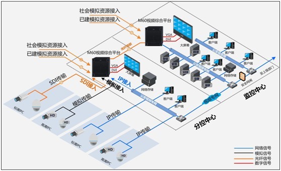 M60視頻綜合平臺(tái),通過(guò)對(duì)模擬、IP、SDI等多種技術(shù)的接入,實(shí)現(xiàn)對(duì)平安城市系統(tǒng)中社會(huì)監(jiān)控資源、公安IP/SDI高清監(jiān)控資源、公安早期模擬監(jiān)控資源等多種監(jiān)控資源的整合。