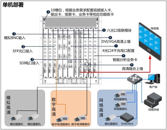 針對(duì)小規(guī)模的應(yīng)用,部署單臺(tái)設(shè)備,實(shí)現(xiàn)高清、標(biāo)清視頻的接入、編碼、存儲(chǔ)、顯示、業(yè)務(wù)應(yīng)用等。單機(jī)模式支持大80路HD-SDI和40路IPC HD信號(hào)同時(shí)輸入或者支持大320路模擬D1和160路IPC D1信號(hào)同時(shí)輸入,單機(jī)支持大160路高清輸出。