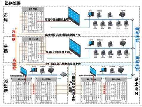 M60視頻綜合平臺(tái)支持派出所-分局-市局-省廳多個(gè)層級(jí)之間的級(jí)聯(lián)部署,通過(guò)光傳輸技術(shù)打破原有視頻窄帶傳輸?shù)钠款i,實(shí)現(xiàn)了高清非壓縮圖像數(shù)據(jù)多層級(jí)之間的無(wú)延時(shí)傳遞。滿(mǎn)足平安城市系統(tǒng)中各級(jí)用戶(hù)主體對(duì)圖像高質(zhì)量及控制低延時(shí)的要求。