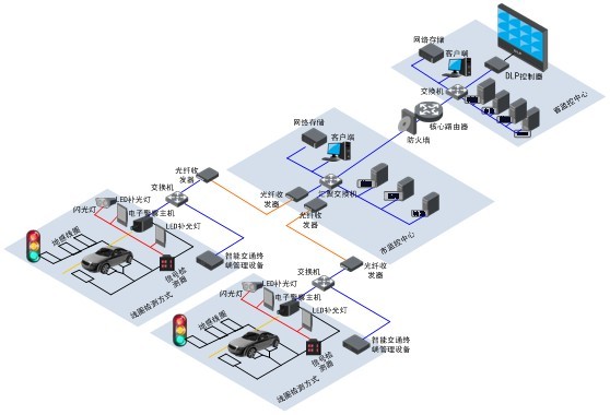 整個(gè)闖紅燈自動(dòng)記錄系統(tǒng)主要由前端采集子系統(tǒng)、網(wǎng)絡(luò)傳輸子系統(tǒng)和中心管理子系統(tǒng)三部分組成,系統(tǒng)整體結(jié)構(gòu)如下: