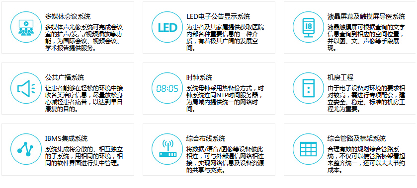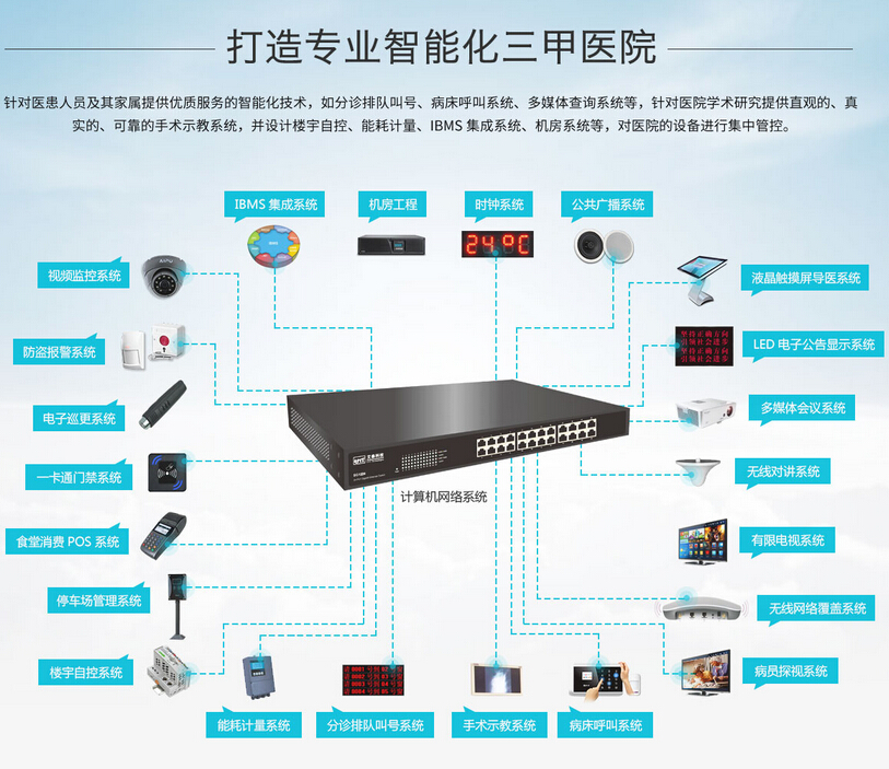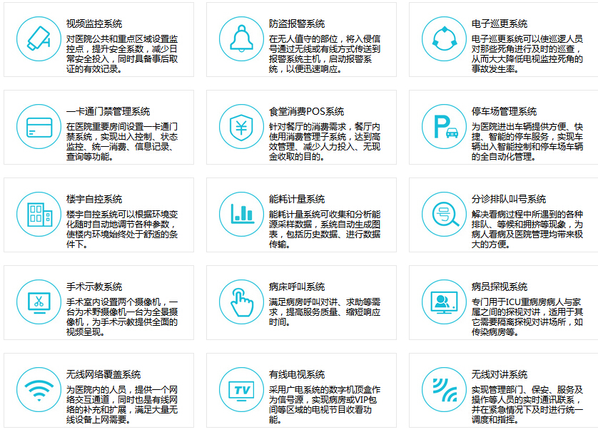 本解決方案包括:綜合布線系統(tǒng)、安全防護系統(tǒng)、網(wǎng)絡(luò)服務(wù)系統(tǒng)、出入人員探視安全管理和排隊呼叫、病房呼叫等系統(tǒng)組成。
