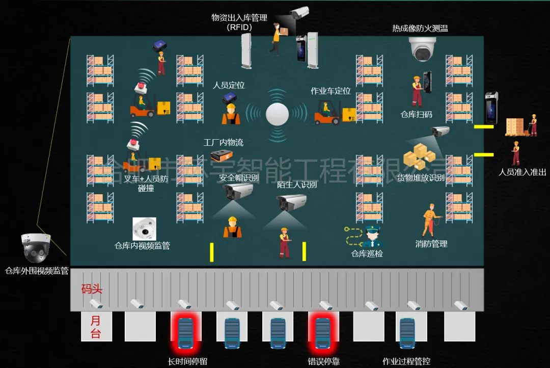 *人員進(jìn)出權(quán)限混亂,無(wú)關(guān)人員隨意出入,事后追溯無(wú)據(jù)可依; *叉車與人員、叉車與叉車碰撞事件頻發(fā),安全管控缺乏有效手段; *作業(yè)人員效率全憑經(jīng)驗(yàn)判斷,工時(shí)測(cè)算無(wú)數(shù)據(jù)支撐,人員配置不合理; *物資出入庫(kù)依賴紙質(zhì)單據(jù),盤點(diǎn)耗時(shí)耗力,易出現(xiàn)賬實(shí)不符; *重要物資存儲(chǔ)區(qū)域缺乏專項(xiàng)監(jiān)管,防火、防盜、防損耗措施不足。 【科技賦能,全鏈管控】: 安全是倉(cāng)庫(kù)管理的核心,通過(guò)多重技術(shù)手段,實(shí)現(xiàn)全方位無(wú)死角防護(hù): 人員準(zhǔn)入精準(zhǔn)管控:采用人臉鑒權(quán)聯(lián)動(dòng)門禁系統(tǒng),只有授權(quán)人員可刷臉進(jìn)出倉(cāng)庫(kù),陌生人靠近重要區(qū)域時(shí),系統(tǒng)實(shí)時(shí)報(bào)警并推送提醒給管理員,事后可快速追溯人員進(jìn)出記錄; 人車安全防撞預(yù)警:在叉車、作業(yè)人員身上部署 UWB 定位設(shè)備,當(dāng)叉車與人員、叉車與叉車距離小于安全閾值時(shí),系統(tǒng)立即發(fā)出語(yǔ)音預(yù)警,提醒司機(jī)減速規(guī)避,大幅降低碰撞風(fēng)險(xiǎn); 重點(diǎn)區(qū)域防火監(jiān)測(cè):在物資密集區(qū)、易燃品存儲(chǔ)區(qū)部署熱成像相機(jī),7×24 小時(shí)實(shí)時(shí)監(jiān)測(cè)溫度變化,一旦出現(xiàn)溫度異常或火點(diǎn),立即觸發(fā)報(bào)警并聯(lián)動(dòng)處置,做到防患于未然; 作業(yè)規(guī)范智能監(jiān)管:通過(guò) AI 相機(jī)自動(dòng)識(shí)別人員安全帽佩戴情況,未佩戴時(shí)現(xiàn)場(chǎng)語(yǔ)音提醒并后臺(tái)記錄,同時(shí)對(duì)貨物堆積占用通道、車輛錯(cuò)誤停靠等違規(guī)行為實(shí)時(shí)監(jiān)測(cè),保障作業(yè)環(huán)境規(guī)范有序。 以數(shù)字化手段優(yōu)化作業(yè)流程,減少人工干預(yù),提升整體運(yùn)營(yíng)效率: 人車定位與效率分析:通過(guò) UWB 定位技術(shù),實(shí)時(shí)追蹤作業(yè)人員和叉車的位置,自動(dòng)統(tǒng)計(jì)人員作業(yè)時(shí)長(zhǎng)、休息時(shí)長(zhǎng)、脫崗情況,為標(biāo)準(zhǔn)工時(shí)測(cè)算和人員配置提供數(shù)據(jù)支撐;同時(shí)分析叉車作業(yè)軌跡和庫(kù)區(qū)停留時(shí)間,優(yōu)化作業(yè)路線,提升物流周轉(zhuǎn)效率; 物資管理智能化:采用 RFID 射頻識(shí)別 + 掃碼 PDA 雙模式,實(shí)現(xiàn)物資出入庫(kù)自動(dòng)識(shí)別、信息實(shí)時(shí)上傳,告別紙質(zhì)單據(jù)繁瑣流程;定期盤點(diǎn)時(shí),通過(guò)手持設(shè)備快速核對(duì)物資信息,確保賬卡物相符,盤點(diǎn)效率提升 80%; 內(nèi)物流自動(dòng)化升級(jí):引入智能 AGV 機(jī)器人,實(shí)現(xiàn)原材料、半成品、成品的自動(dòng)搬運(yùn)、出入庫(kù)和存儲(chǔ),構(gòu)建 “貨到人的高效作業(yè)模式”,減少揀貨、補(bǔ)貨人工投入,同時(shí)避免人為操作失誤,提升物流流轉(zhuǎn)穩(wěn)定性; 數(shù)字化月臺(tái)管理:通過(guò)智能相機(jī)識(shí)別車牌、車輛停靠狀態(tài)、裝載進(jìn)度,結(jié)合顯示屏和語(yǔ)音播報(bào),實(shí)現(xiàn)車輛叫號(hào)、停靠超時(shí)提醒、作業(yè)人數(shù)統(tǒng)計(jì)等功能,讓月臺(tái)調(diào)度有序高效,減少車輛等待時(shí)間。 【一體化管理平臺(tái)】: 360° 全景監(jiān)控覆蓋:監(jiān)控覆蓋倉(cāng)庫(kù)內(nèi)外,結(jié)合 AR 技術(shù)疊加點(diǎn)位標(biāo)簽和數(shù)據(jù)信息,全局態(tài)勢(shì)一目了然; 平臺(tái)整合:整合安全報(bào)警、作業(yè)數(shù)據(jù)、物資流轉(zhuǎn)、設(shè)備狀態(tài)等核心信息,實(shí)時(shí)展示倉(cāng)庫(kù)運(yùn)營(yíng)動(dòng)態(tài),支持?jǐn)?shù)據(jù)統(tǒng)計(jì)分析和報(bào)表導(dǎo)出; 支持移動(dòng)端遠(yuǎn)程管控:管理員隨時(shí)隨地接收?qǐng)?bào)警提醒、查看倉(cāng)庫(kù)狀態(tài)、審批相關(guān)流程,實(shí)現(xiàn) “無(wú)人值守,有人監(jiān)管”; 安消一體聯(lián)動(dòng):將消防火災(zāi)報(bào)警、可燃?xì)怏w泄漏、用電安全監(jiān)測(cè)等數(shù)據(jù)與安防系統(tǒng)融合,出現(xiàn)異常時(shí)自動(dòng)觸發(fā)應(yīng)急預(yù)案,聯(lián)動(dòng)視頻復(fù)核、人員通知,最大化降低損失。
