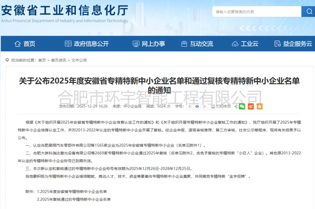 根據(jù)安徽省工信廳發(fā)布的通知,本次新認定企業(yè)稱號有效期為2025年12月26日至2028年12月25日。入選企業(yè)將在政策扶持、融資服務、人才引進、市場開拓等方面獲得更多支持,進一步推動企業(yè)成長。