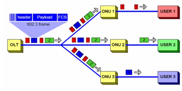 下行的數(shù)據(jù)流采用廣播方式,OLT將802.3格式的以太網(wǎng)幀數(shù)據(jù)流通過單播復制的方式推送到所有的ONU處;ONU通過判斷以太網(wǎng)幀幀頭里的由OLT分配的LLID(Logical Link ID)來判斷是否接收,接收屬于自己的數(shù)據(jù)幀,將不屬于自己的數(shù)據(jù)幀丟棄。如圖1所示。