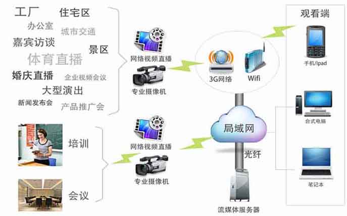 手機(jī)視頻直播系統(tǒng)是無(wú)線網(wǎng)絡(luò)技術(shù)應(yīng)用多的領(lǐng)域之一。手機(jī)視頻直播系統(tǒng)主要用于對(duì)重要區(qū)域或遠(yuǎn)程地點(diǎn)的監(jiān)督和控制(如工廠、辦公室、住宅區(qū)、景區(qū)、城市交通、體育直播、婚慶直播、企業(yè)視頻會(huì)議、新聞發(fā)布會(huì)、產(chǎn)品推廣會(huì)、大型演出、嘉賓訪談等),視頻直播系統(tǒng)將被監(jiān)控點(diǎn)實(shí)時(shí)采集的視頻文件及時(shí)地傳輸給監(jiān)控中央,實(shí)時(shí)動(dòng)態(tài)地講演被監(jiān)測(cè)點(diǎn)的情況,及時(shí)發(fā)現(xiàn)問(wèn)題并進(jìn)行處理。